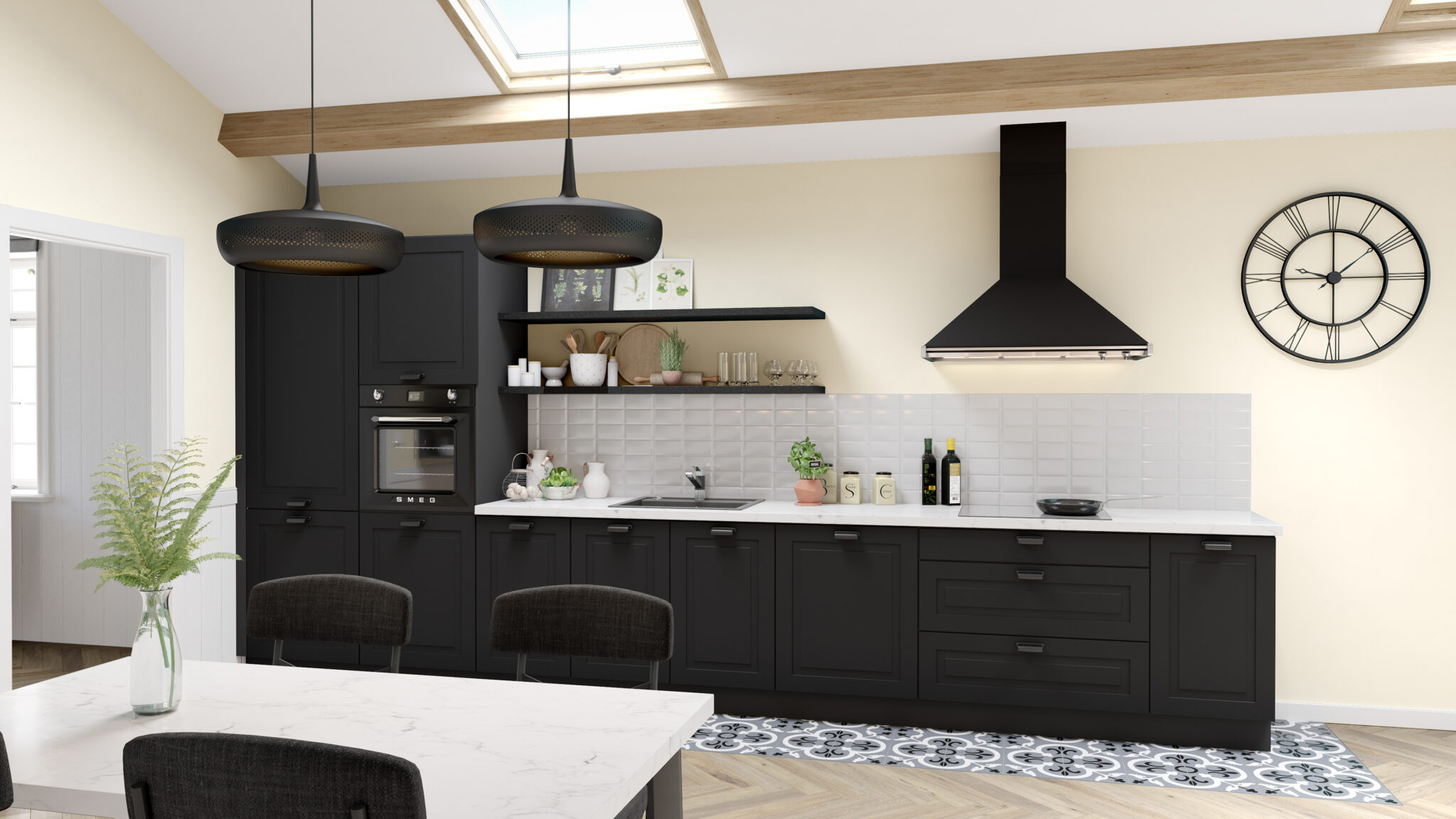 Sous leurs combles, Assia et Laurent ont invité le style cottage contemporain avec élégance. Les portes à cadre et la crédence en carrelage métro posent le décor, tandis que la hotte pyramide affirme le charme traditionnel. Une étagère déco complète l’ensemble avec légèreté. Le design accessible d’èggo leur a permis de concilier l’authenticité du style cottage et la modernité d’un espace atypique.