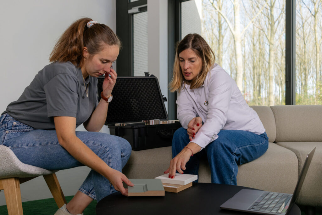 Om je thuis te helpen bij het visualiseren van je toekomstige keuken, neemt je adviseur verschillende stalen van materialen, kleuren en texturen mee. Zo kun je zien hoe deze afwerkingen in je interieur passen, in natuurlijk licht, zodat je de beste keuze kunt maken!