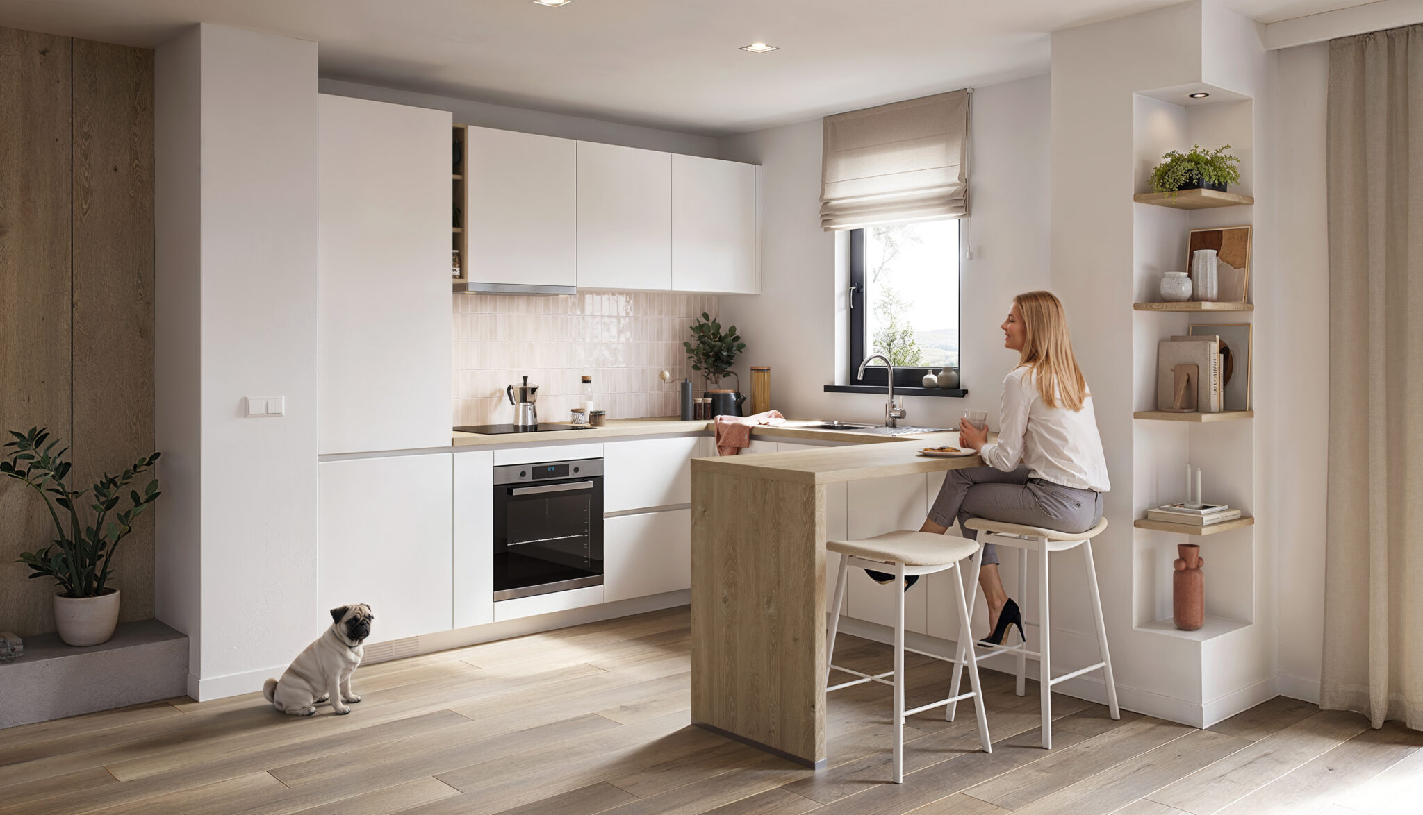 Barbara leeft tegen 100 per uur. Met al haar online vergaderingen en geïmproviseerde maaltijden had ze een keuken nodig die bij haar paste: eenvoudig, vlot, efficiënt. Daarom koos ze voor een keuken met toog, ideaal voor een kopje koffie terwijl ze haar mails checkt of een snelle apero. Ze heeft graag dat alles binnen handbereik is, maar zonder dat het zwaar oogt: op de decoratieve rekken kan ze haar voornaamste spullen kwijt, terwijl het geheel toch licht blijft. Bij èggo vond ze betaalbaar design dat kan worden afgestemd op haar dagelijks leven zonder compromissen wat stijl betreft.
