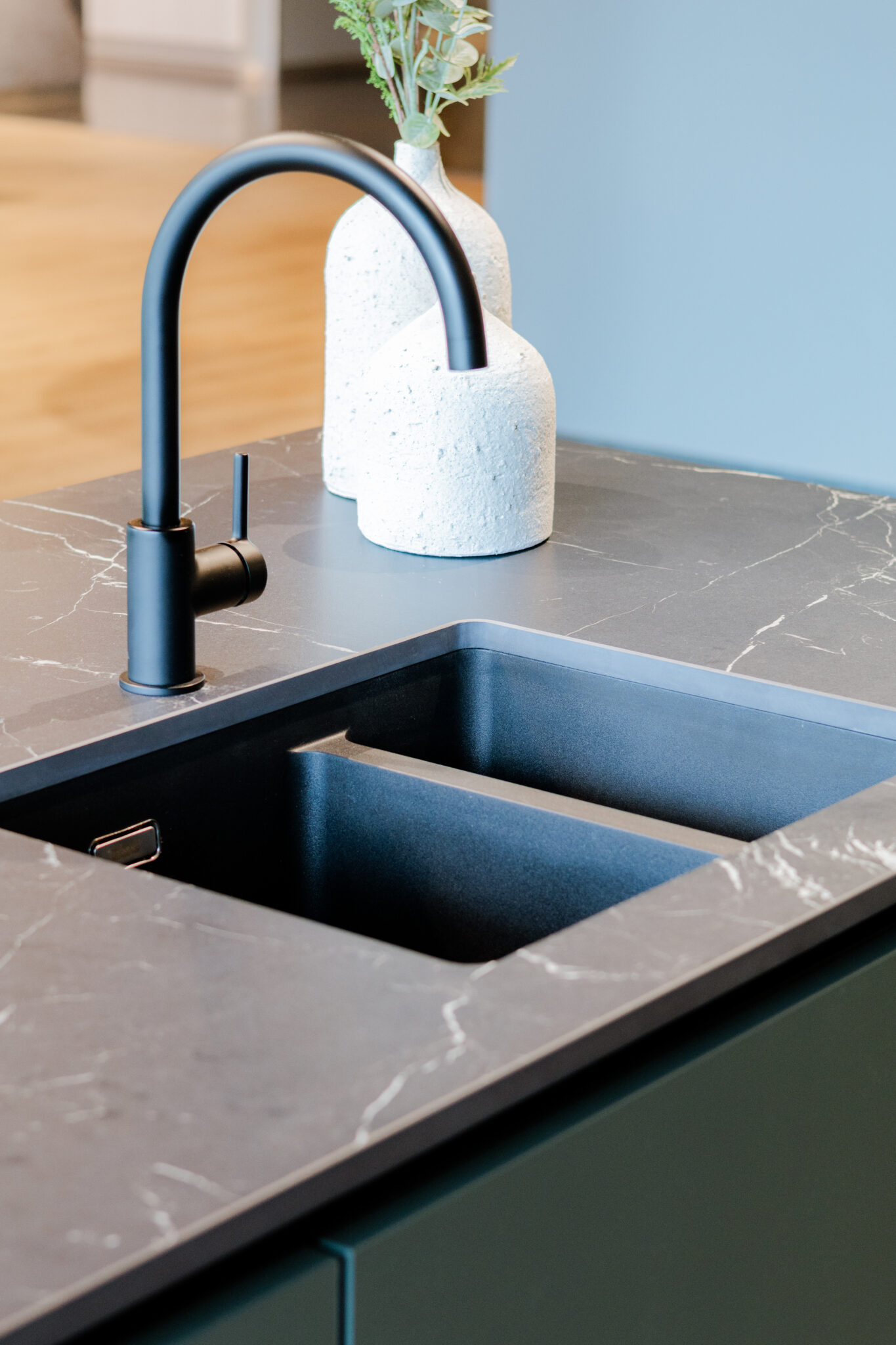 Als je gekozen hebt voor een aanrecht in graniet of composiet wordt je spoelbak onder het niveau van het werkblad geplaatst. De randen van het werkblad blijven dus zichtbaar. Dat type plaatsing maakt het makkelijker om schoon te maken, aangezien je het afval rechtstreeks in de spoelbak kan vegen. Bovendien geeft een onderbouwspoelbak je keuken een moderne en elegante look mee en accentueert hij de schoonheid van het materiaal van je werkblad.